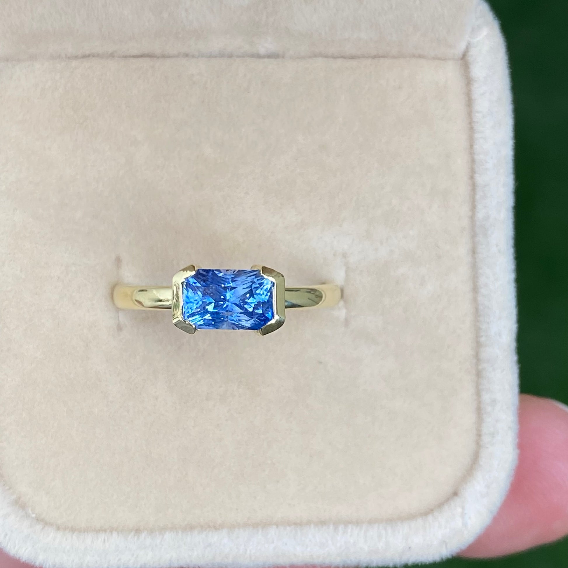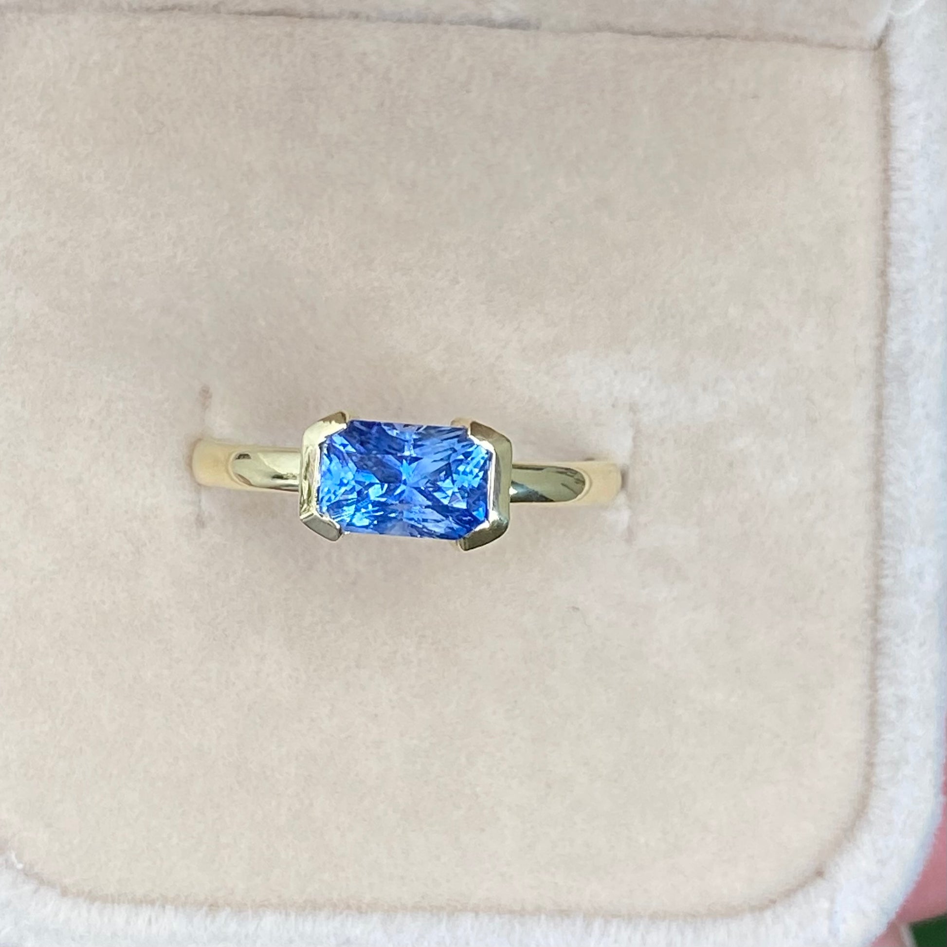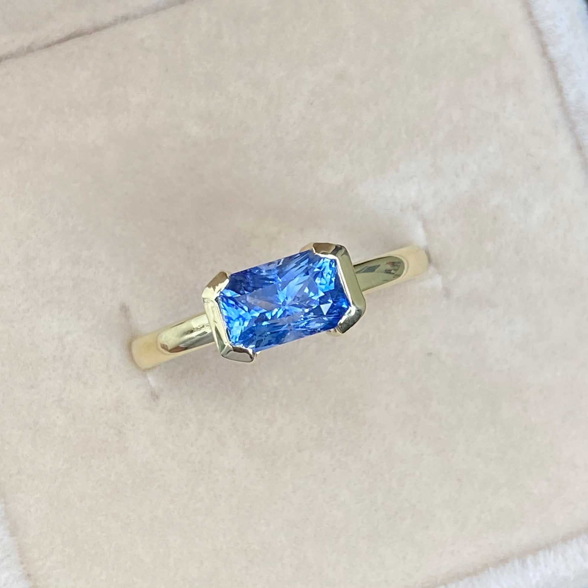 An east-west set emerald cut, Natural Ceylon (Sri Lanka) Blue Sapphire in our brand new half-bezel design. Inspired by a minimal and clean silhouette, the flat band detail compliments the straight edges of the bezel itself while the setting details still allow light to enter the centre stone. A dreamy coloured engagement ring for the right moment or a perfect special gift for her. This sapphire is clean and has great sparkles.