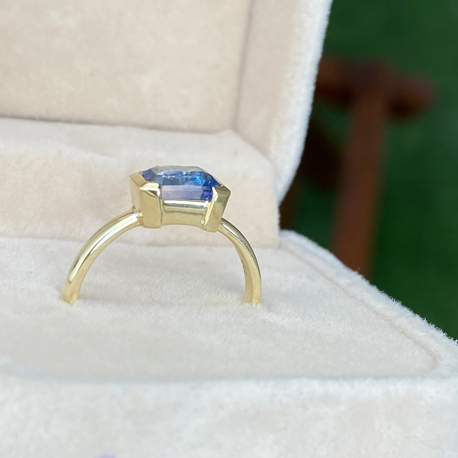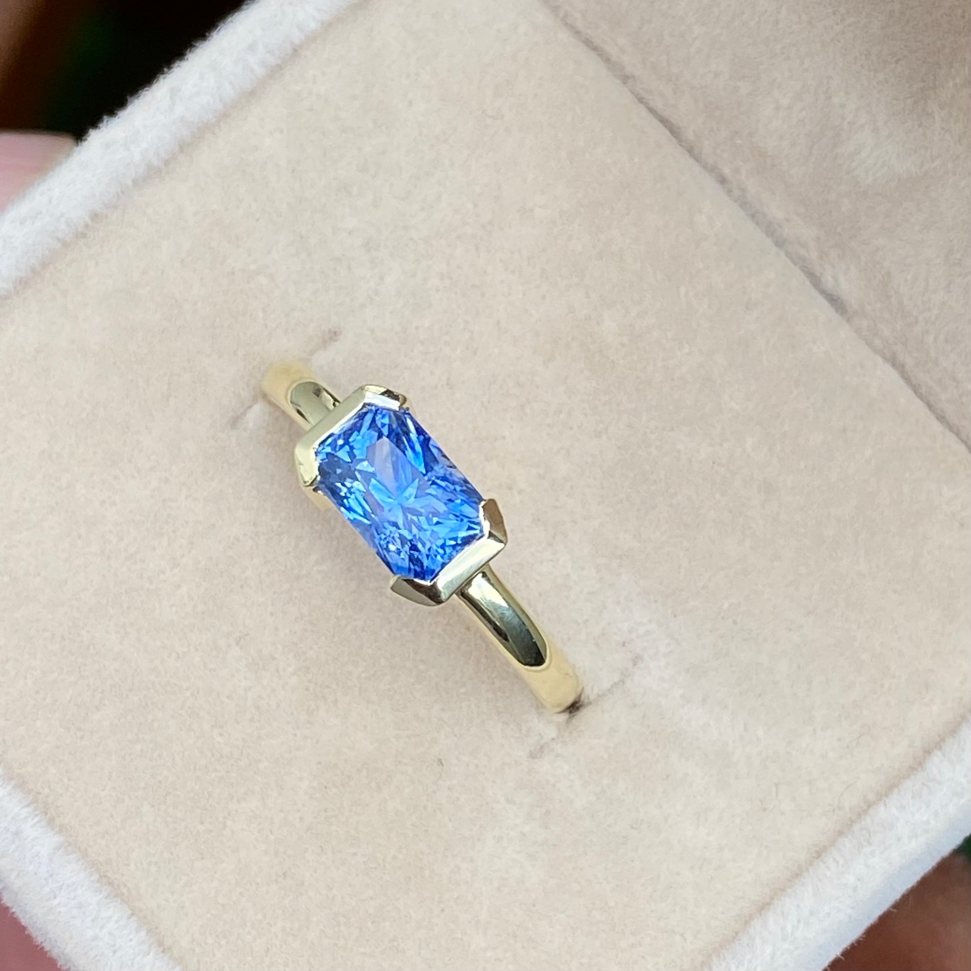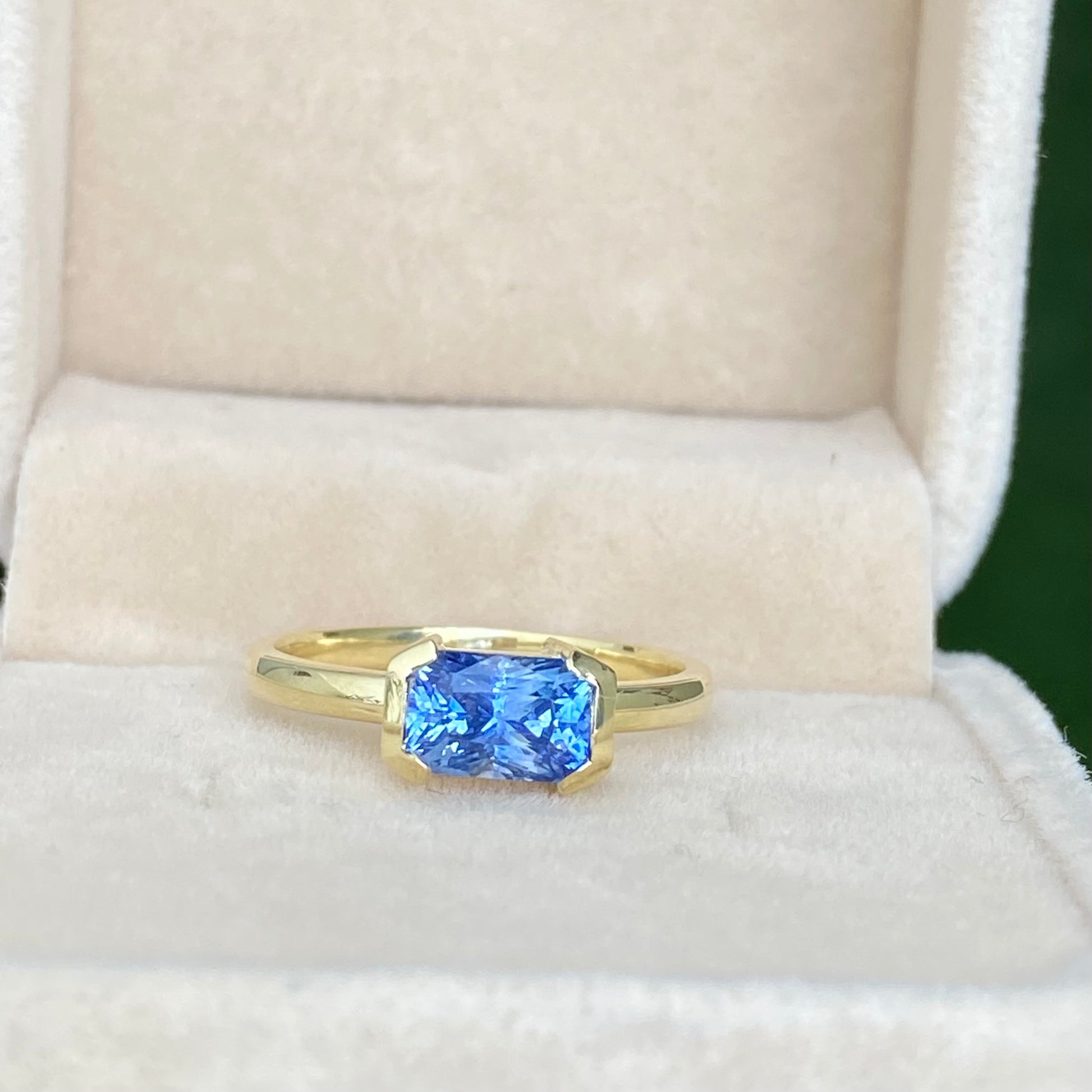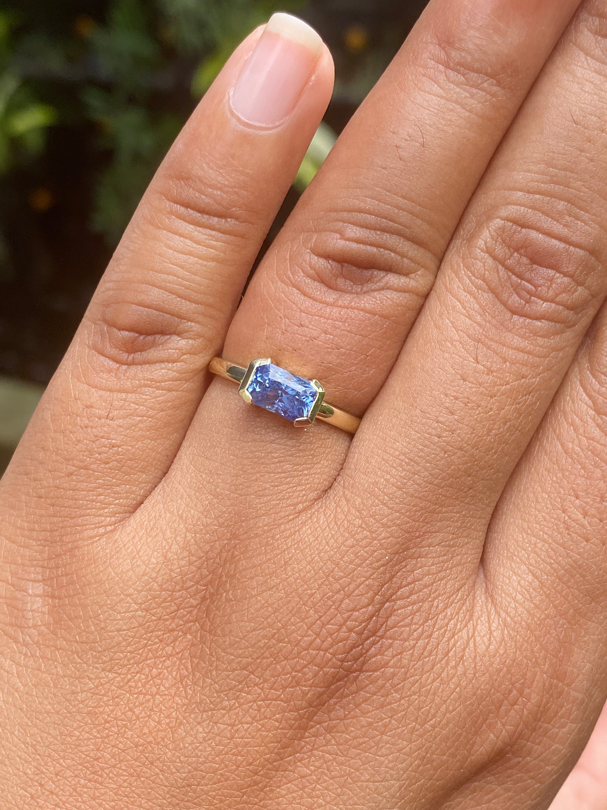 An east-west set emerald cut, Natural Ceylon (Sri Lanka) Blue Sapphire in our brand new half-bezel design. Inspired by a minimal and clean silhouette, the flat band detail compliments the straight edges of the bezel itself while the setting details still allow light to enter the centre stone. A dreamy coloured engagement ring for the right moment or a perfect special gift for her. This sapphire is clean and has great sparkles.