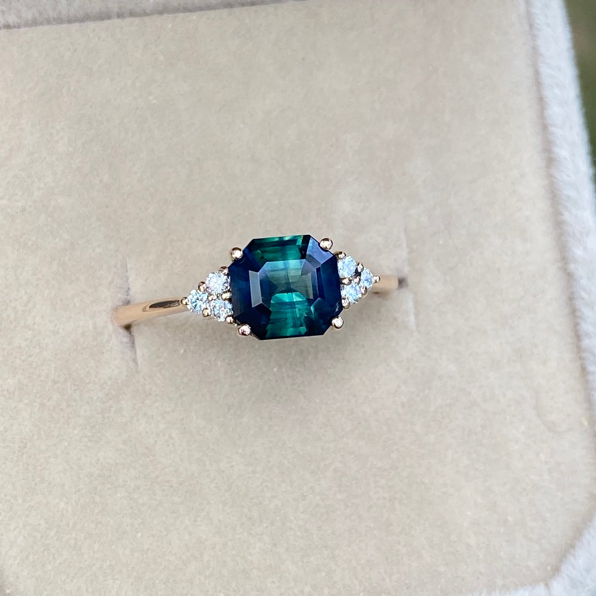 Teal Sapphire Ring, Green Sapphire Ring, Engagement Ring, Dark Teal Sapphire, Diamond Cluster Ring, Gifts for her, Easter Gifts