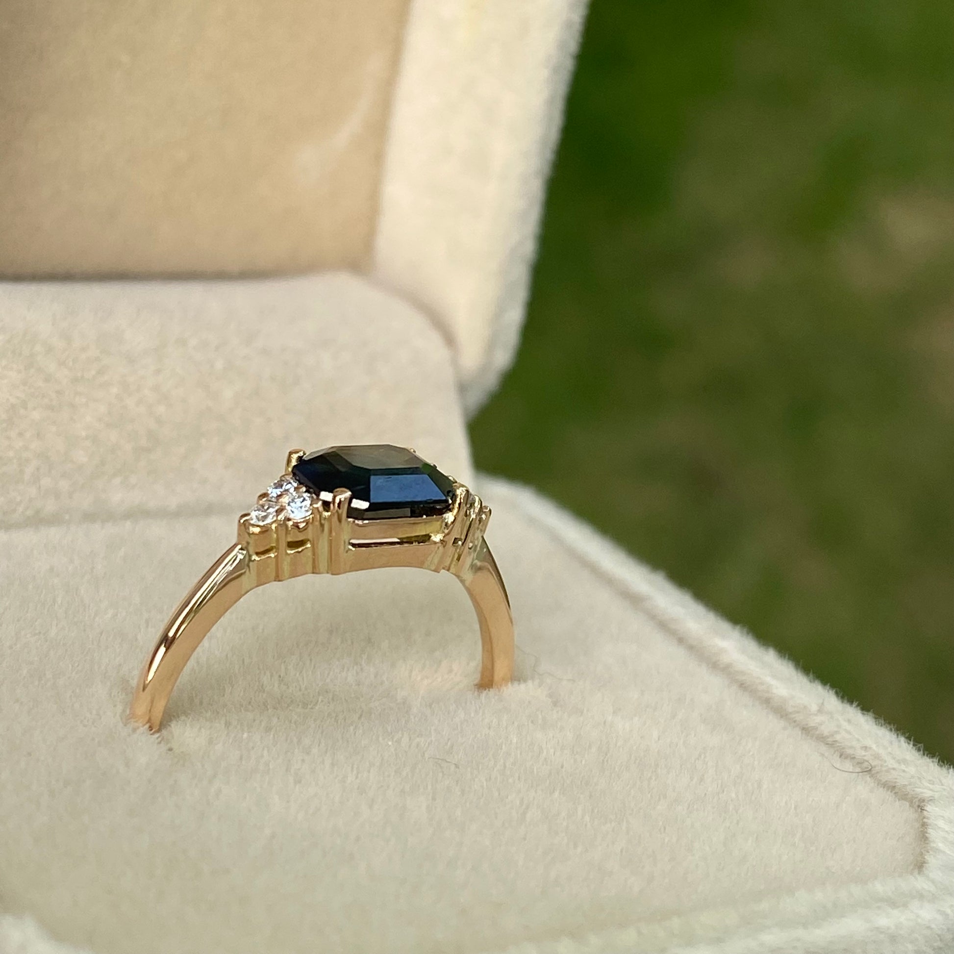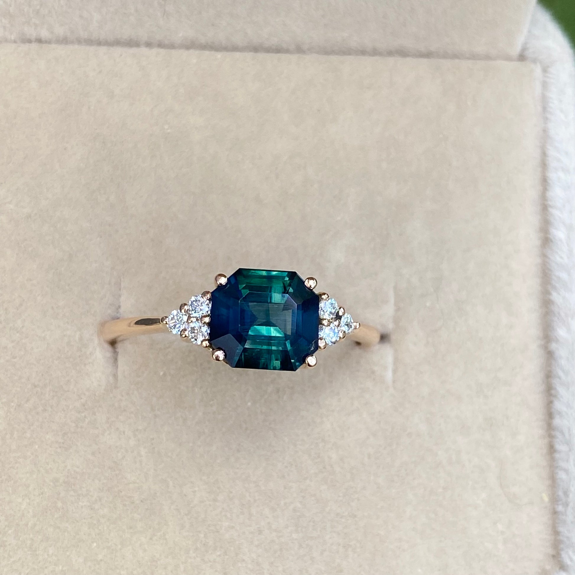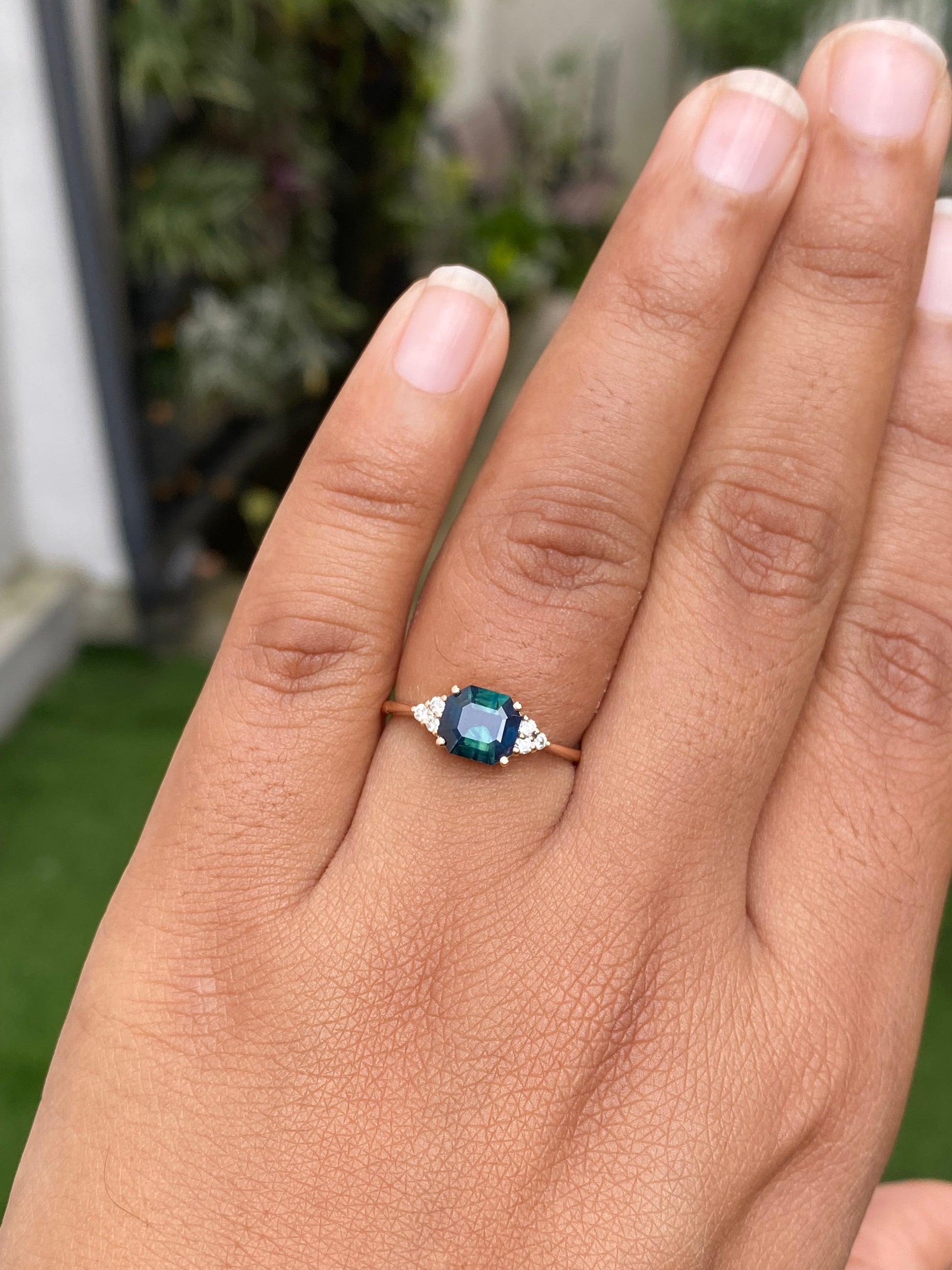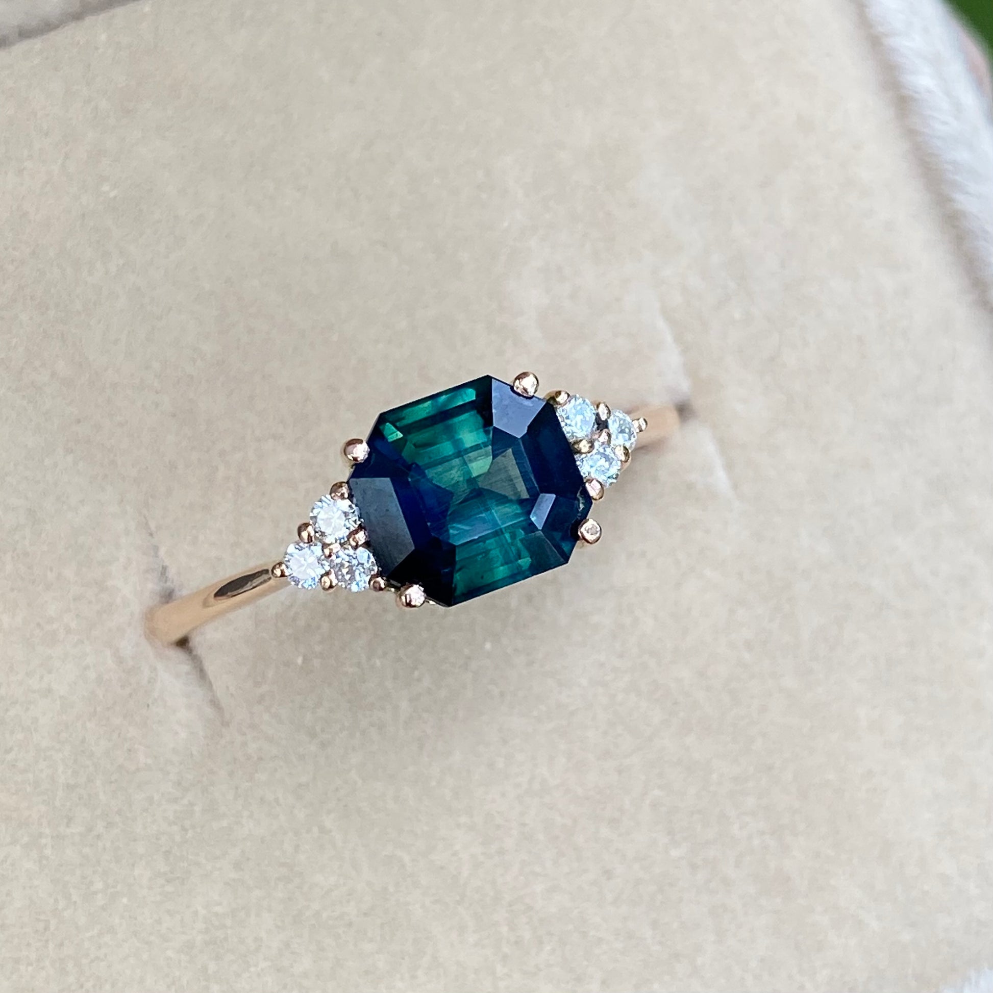 For those with wild, romantic hearts, our brand new, A unique, Emerald -cut dark blue green sapphire nestles between six petite diamonds, enveloped in secure 14k Rose gold—a manifestation of hopeless romance. We love this ring for someone that wants something a little different in their engagement ring, but that loves the look of a classic diamond cluster ring.