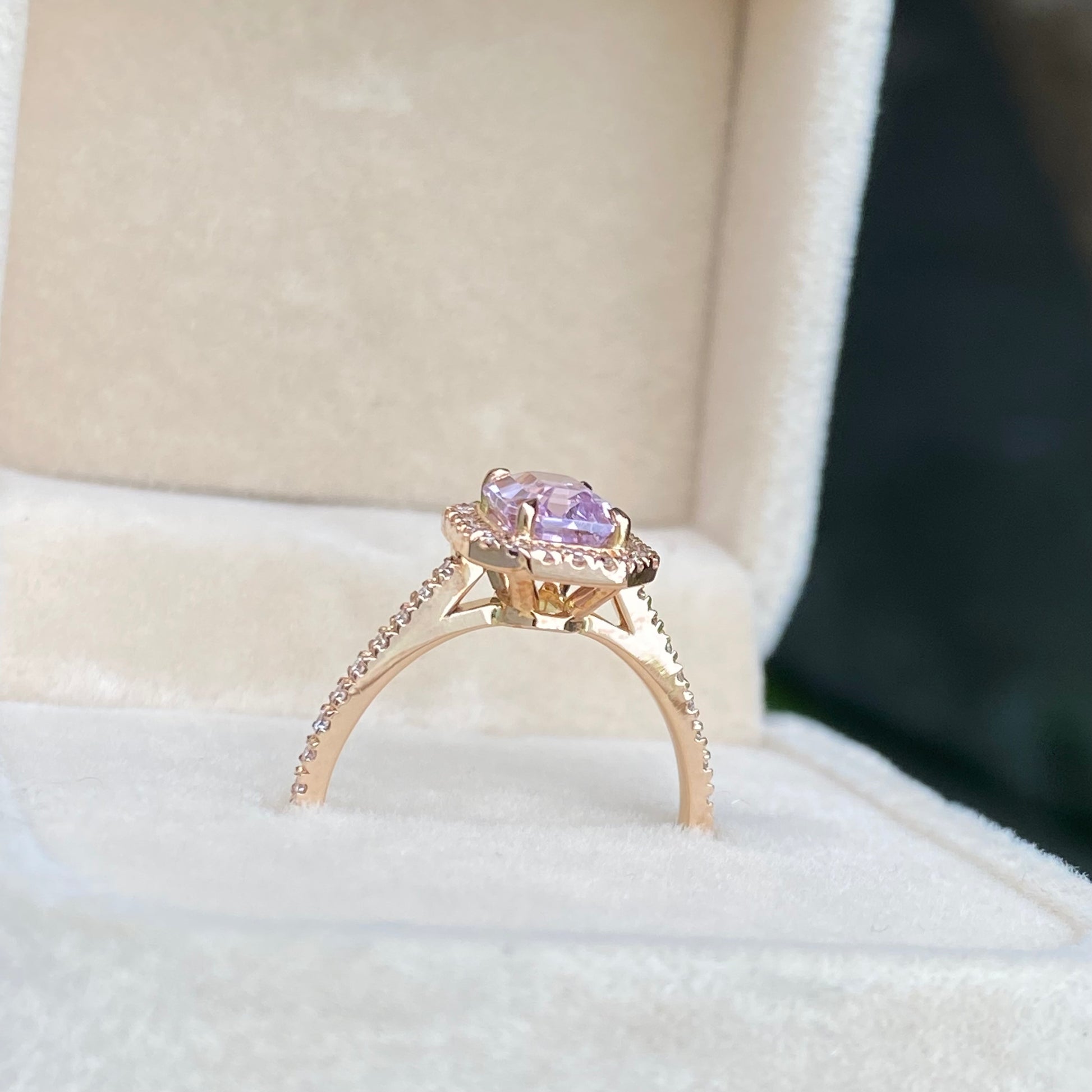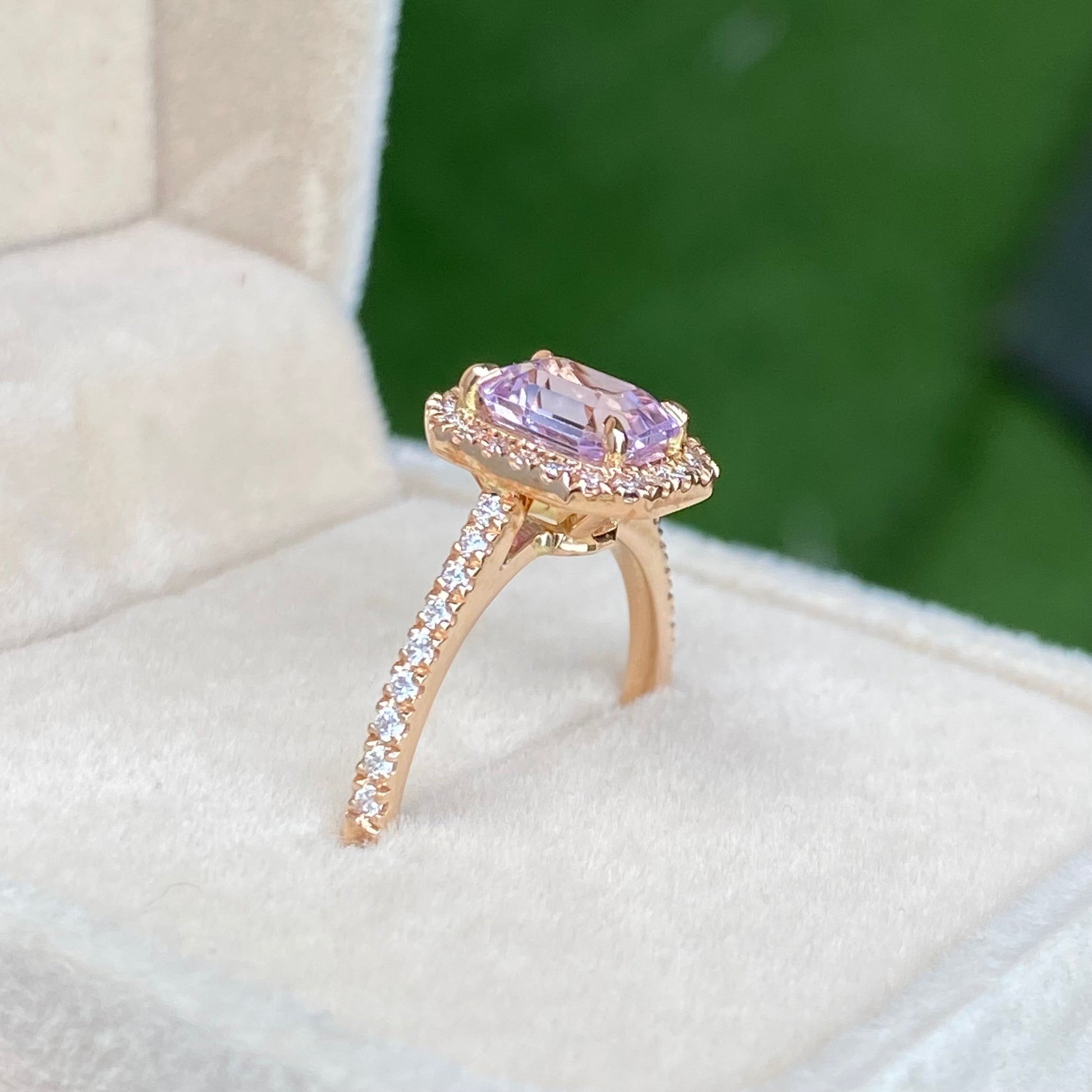 This timeless elegant yet unique Light purple sapphire engagement ring is crafted in a 14k rose gold Halo Diamond Ring setting featuring a 1.65-carat emerald cut natural sapphire center unheated & untreated. This halo diamond sapphire ring is a perfect diamond alternative engagement ring for brides who love non-traditional engagement rings.