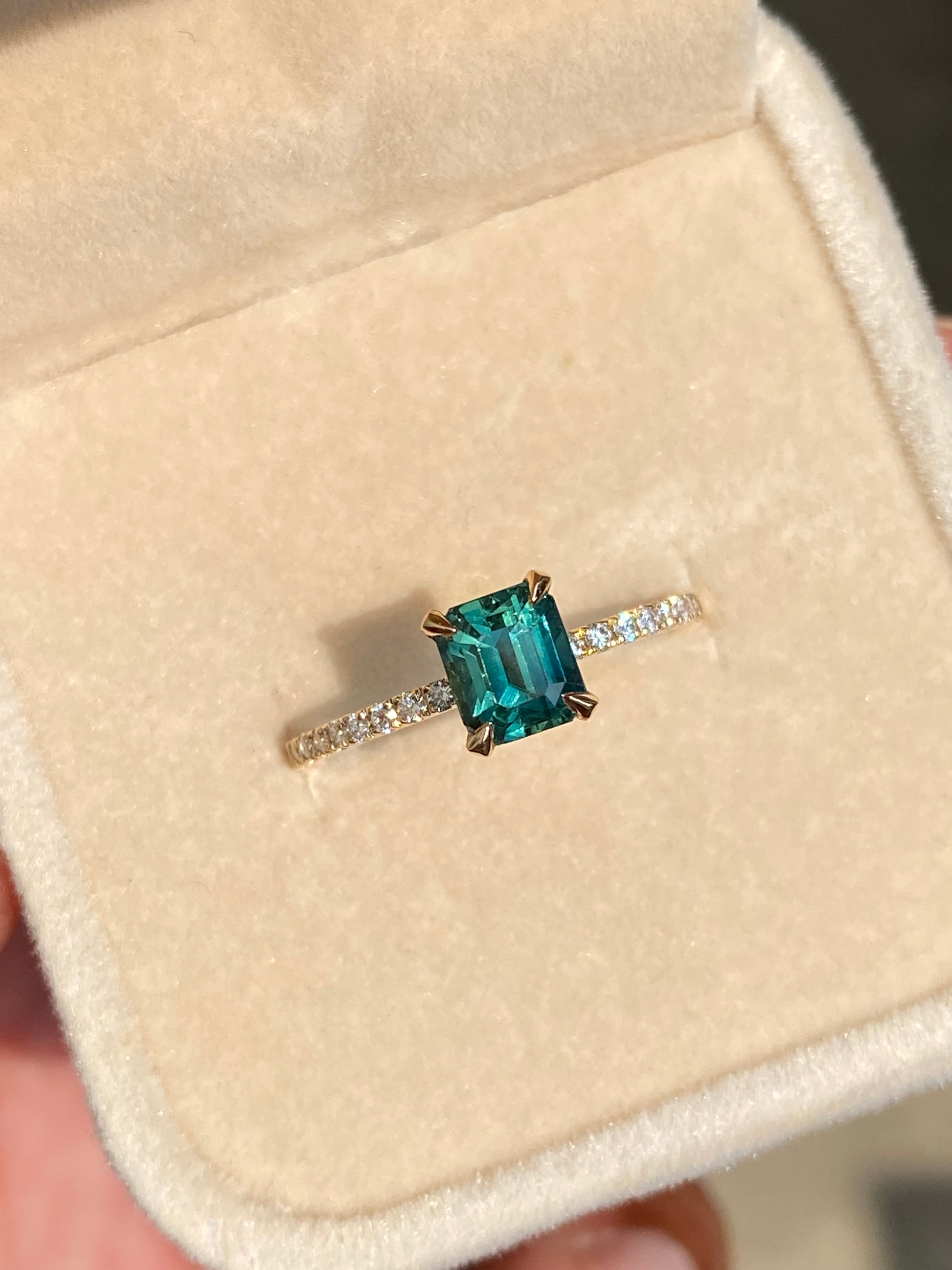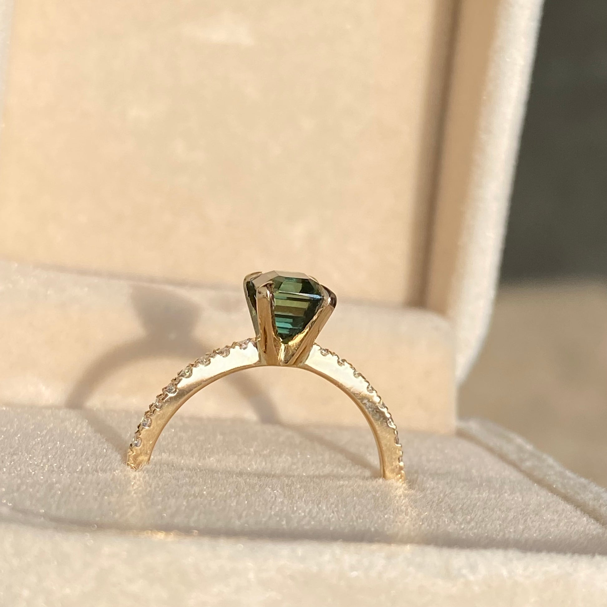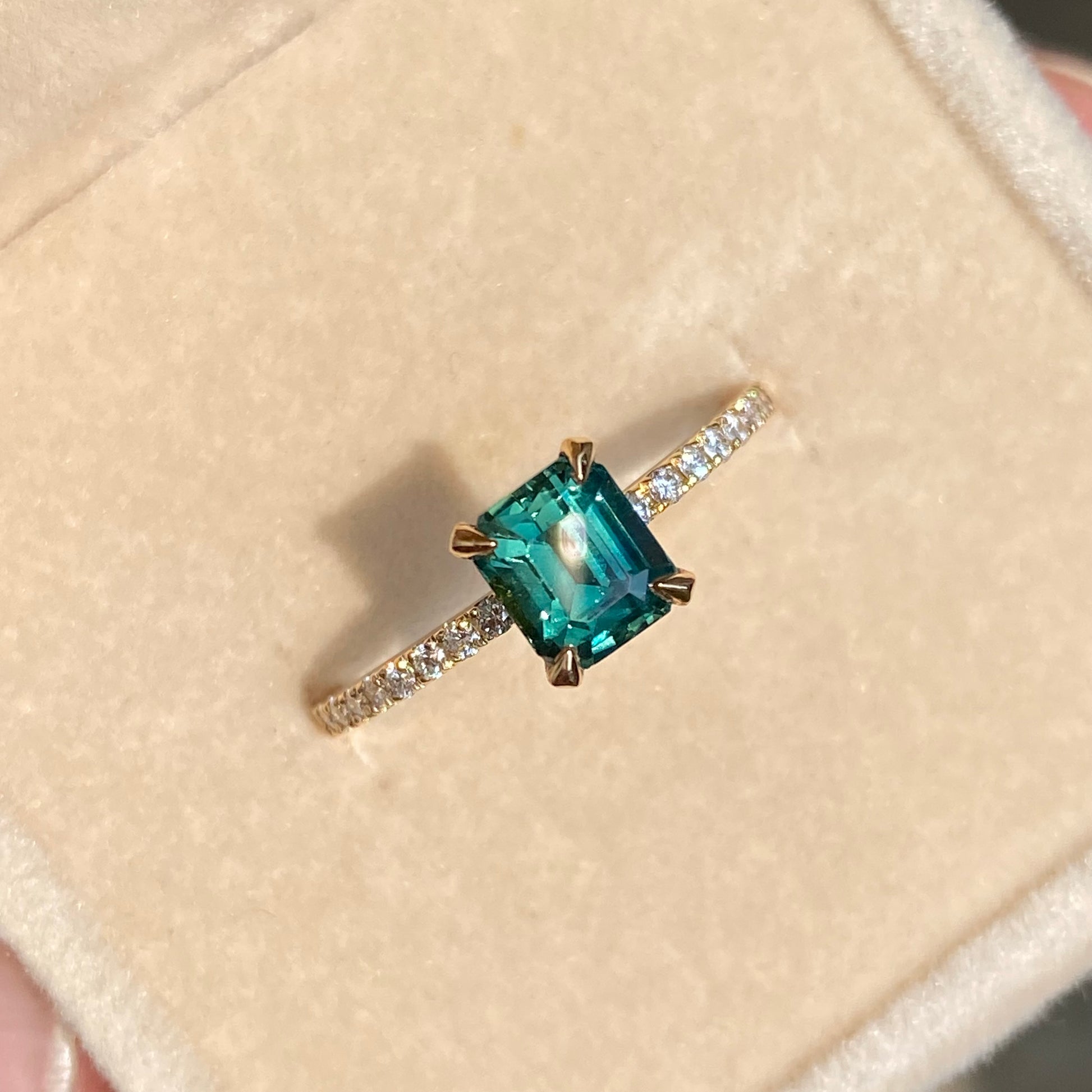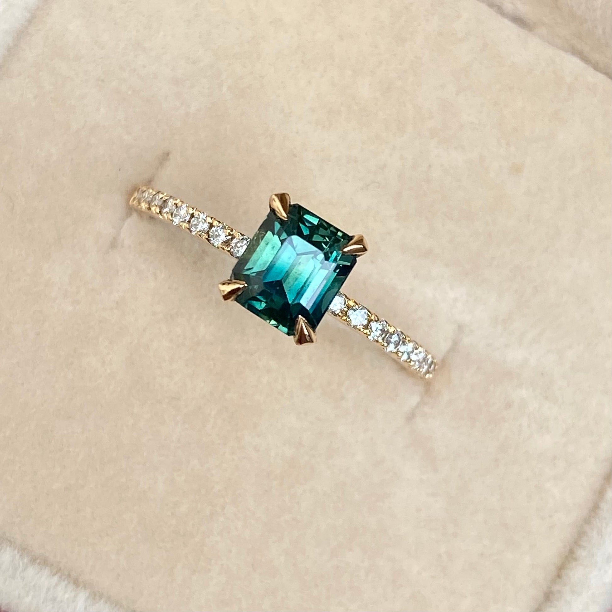 Natural 1.55ct teal sapphire Engagement ring is a stunner, This is a handmade unique piece in our workshop. This has a beautiful Teal Green Color well paired with natural diamonds on a paved band.
