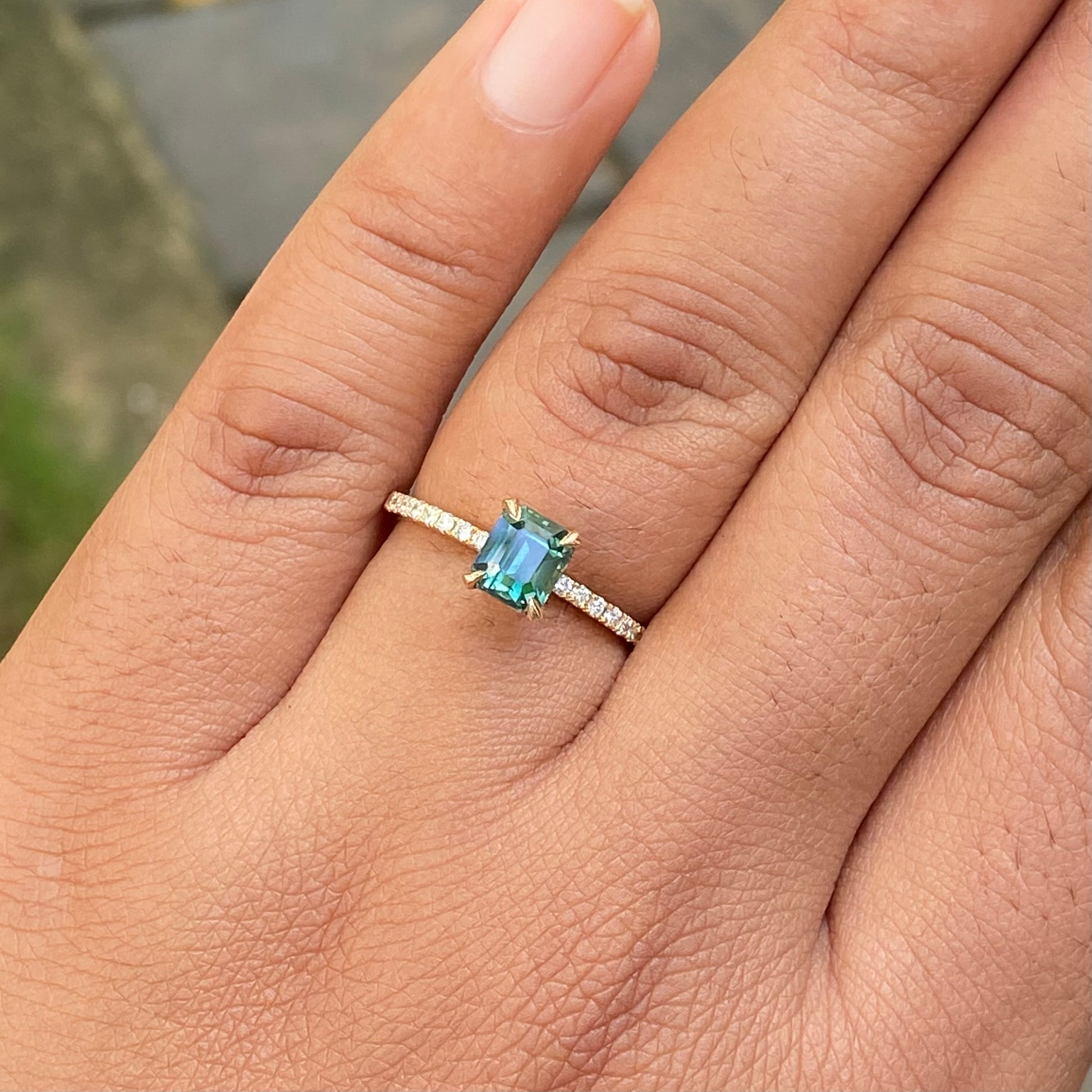 Natural Teal Sapphire Diamond Pave band Engagement Ring