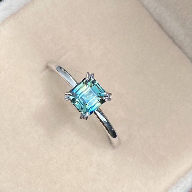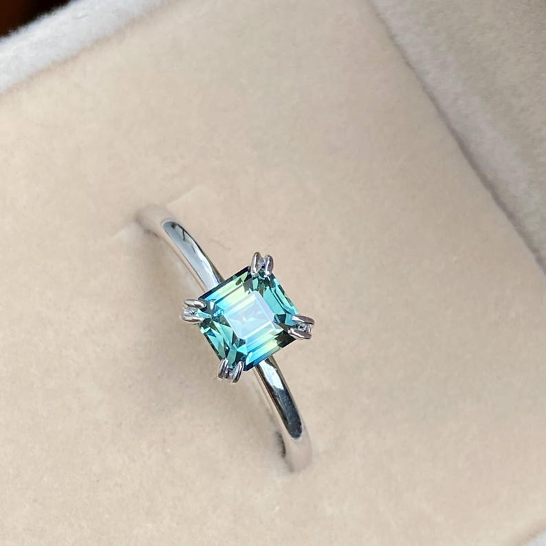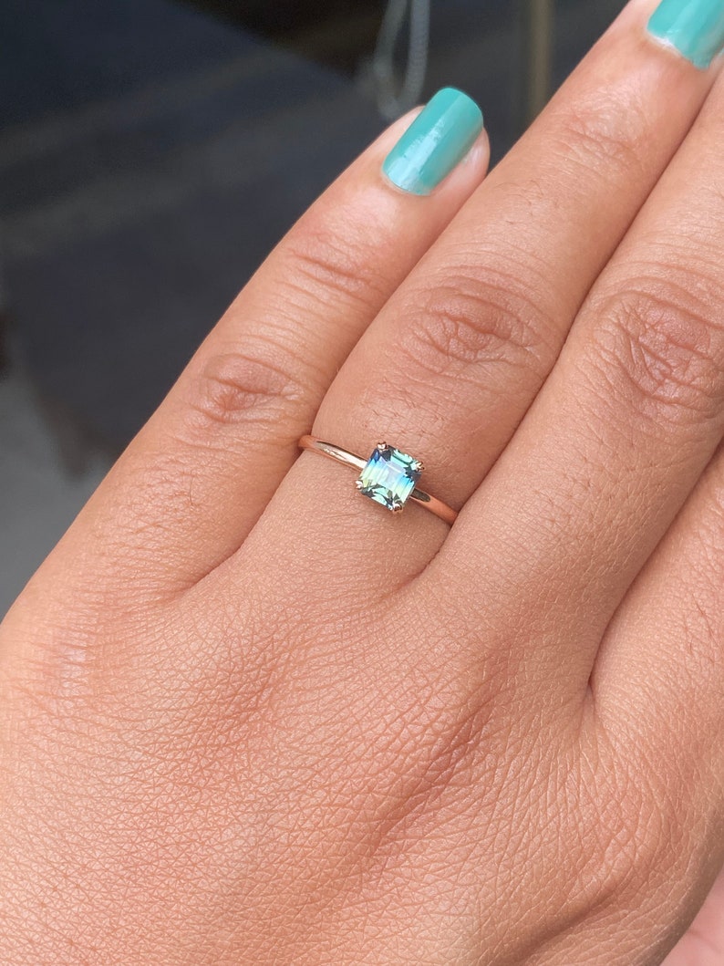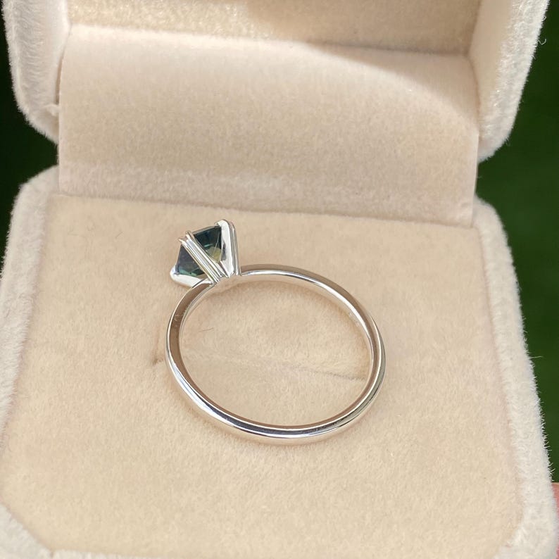 This Sapphire engagement ring is featuring Unheated Parti Sapphire featuring a Bicolor/ Teal Peacock sapphire, It has a very beautiful teal & mint green mix and sapphire is clean, a gorgeous stone. This stone has excellent cut (No Window). it sets in a simple solitaire 14K solid white gold in a sleek and elegant low profile mount. A perfect ring gift for her , also would make a special anniversary ring or a Proposal ring.
