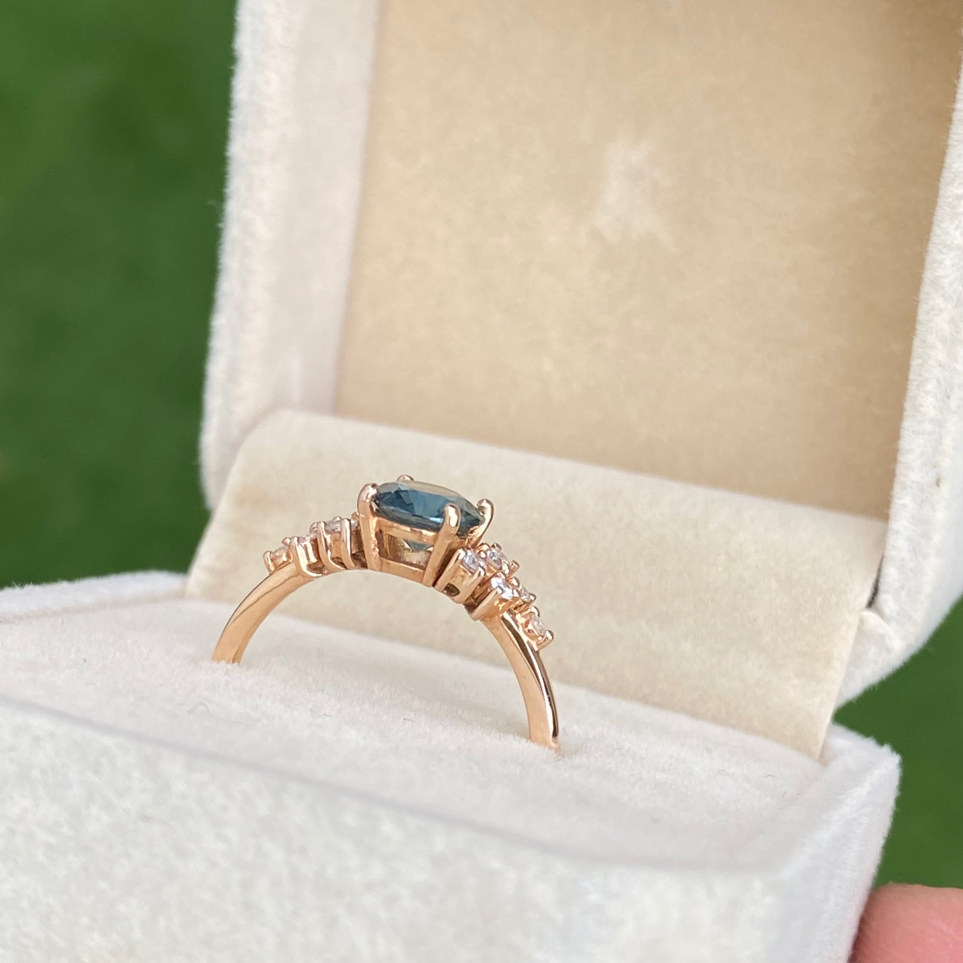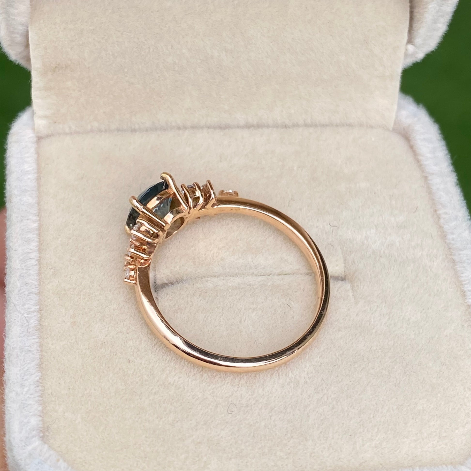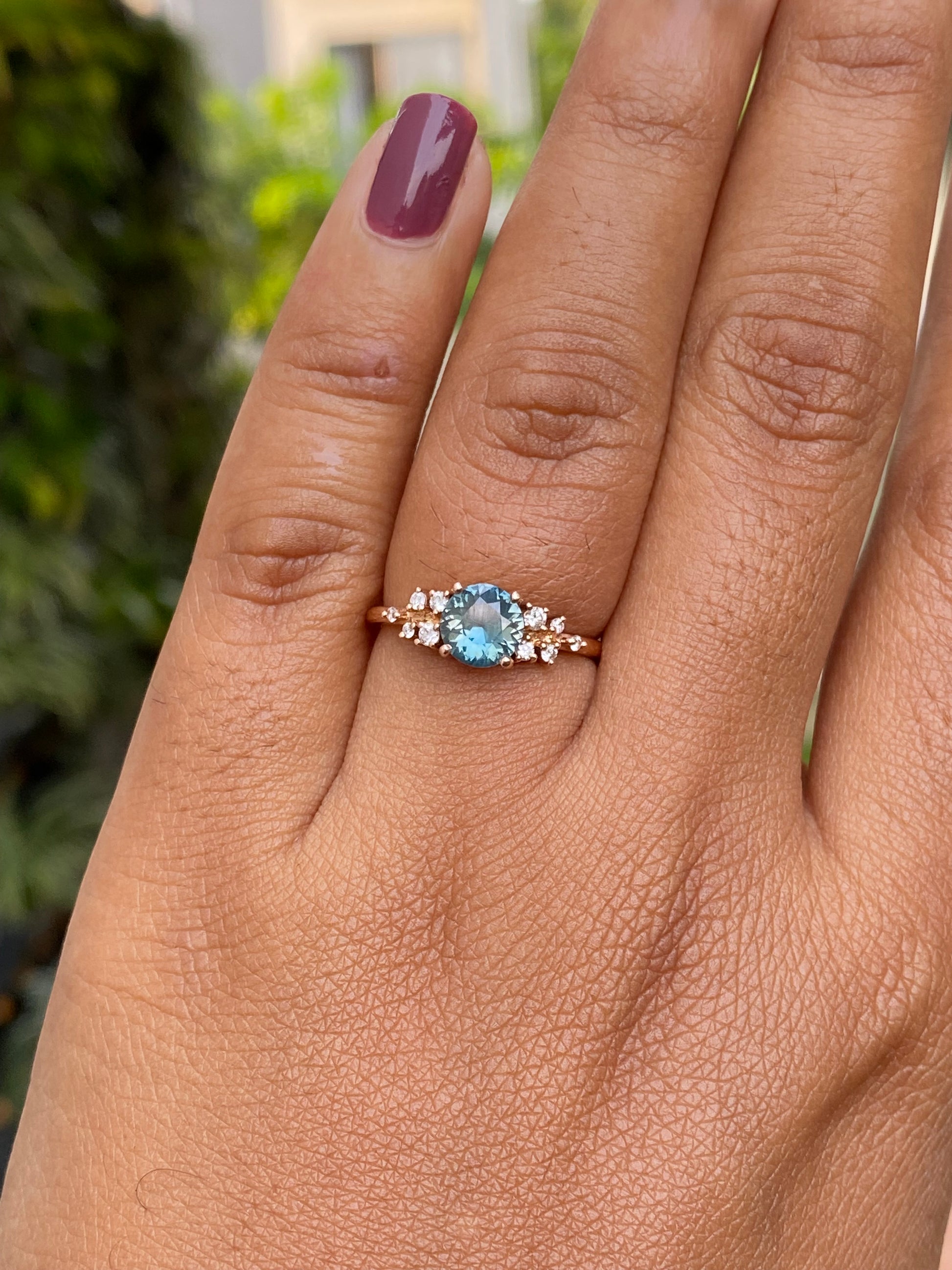 This pastel sapphire engagement ring is a nature inspired design with unique celestial scattered diamond accents. This Ethical Engagement ring features a center round blue sapphire that is accented by clusters of natural diamonds in a beautiful vine like design.