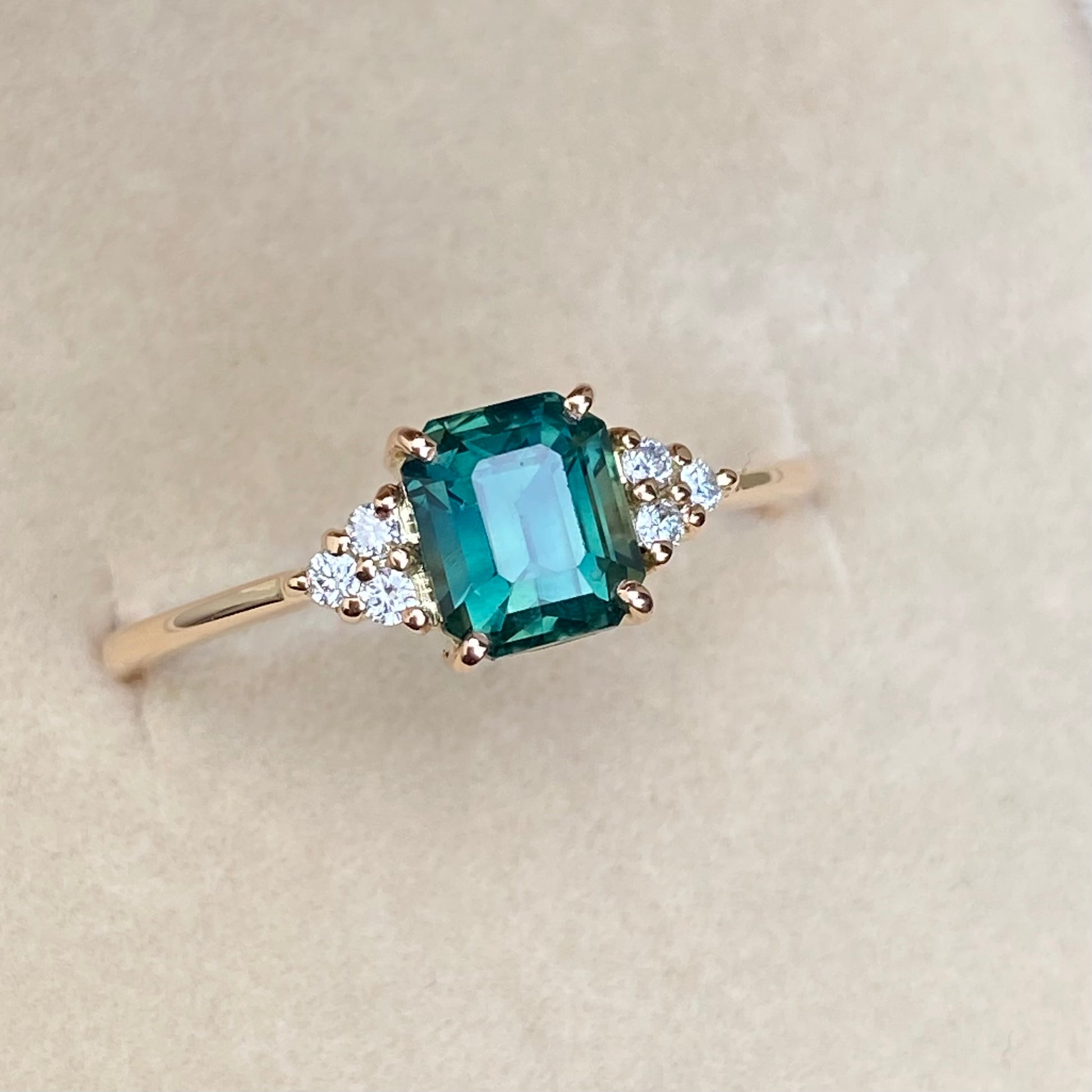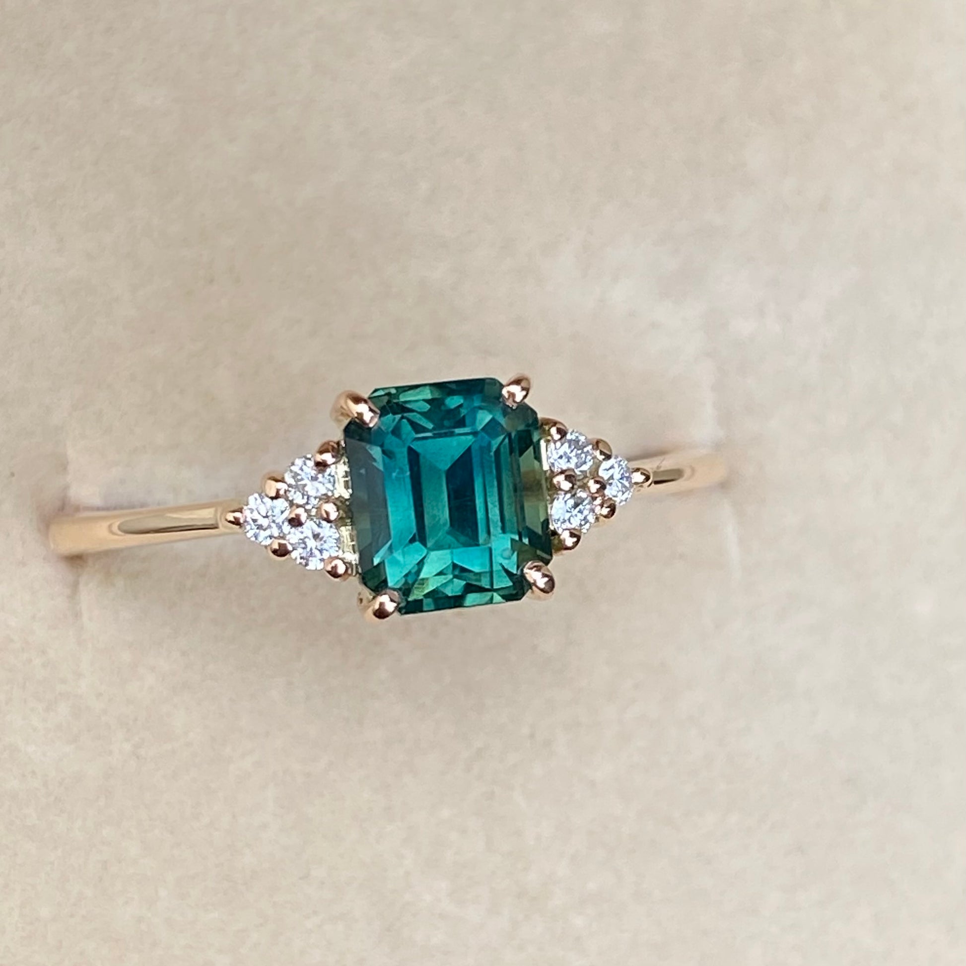 This Teal sapphire ring is ready to ship in 14K Rose Gold, Other metal options will take 4-6 days to remake with the same Sapphire Gemstone.