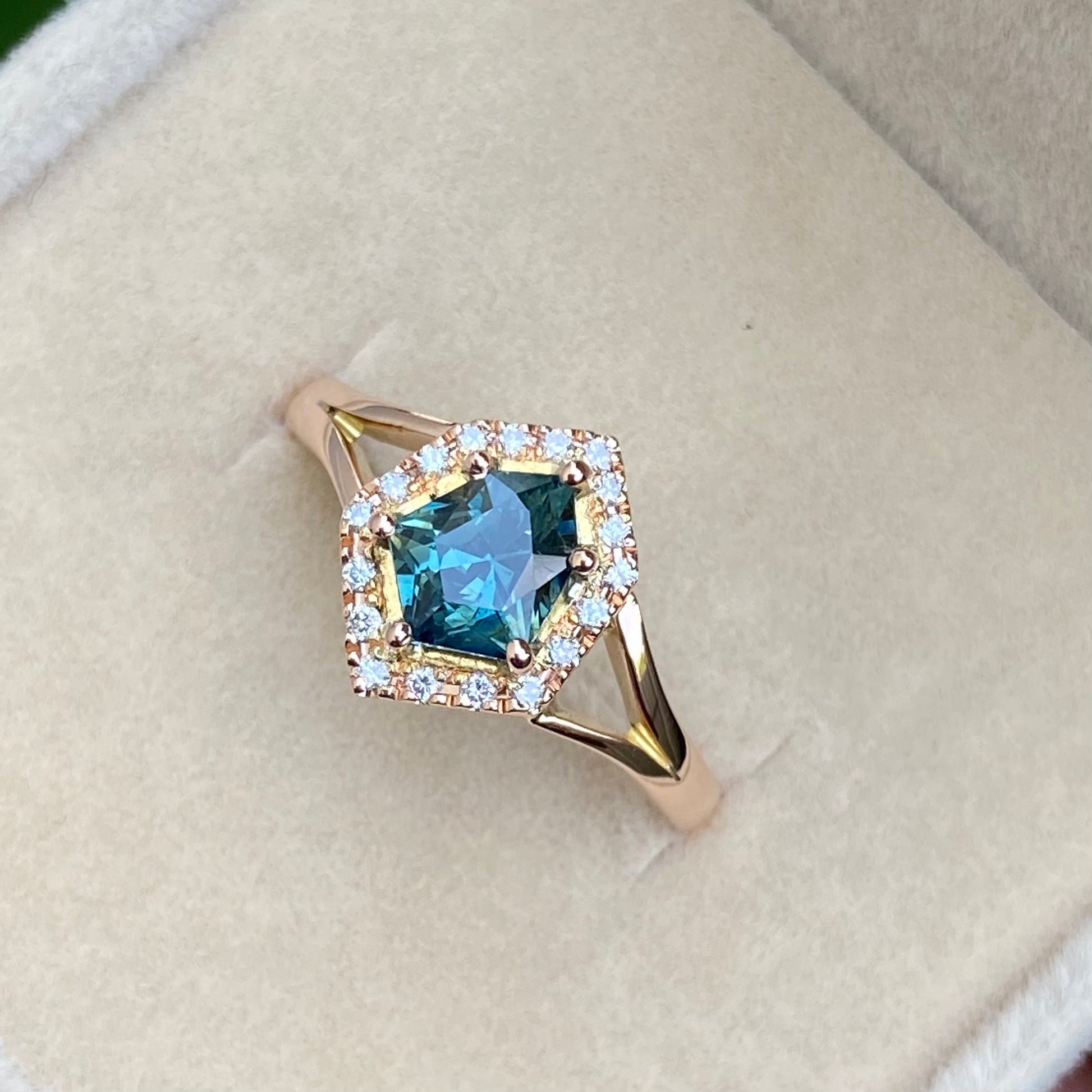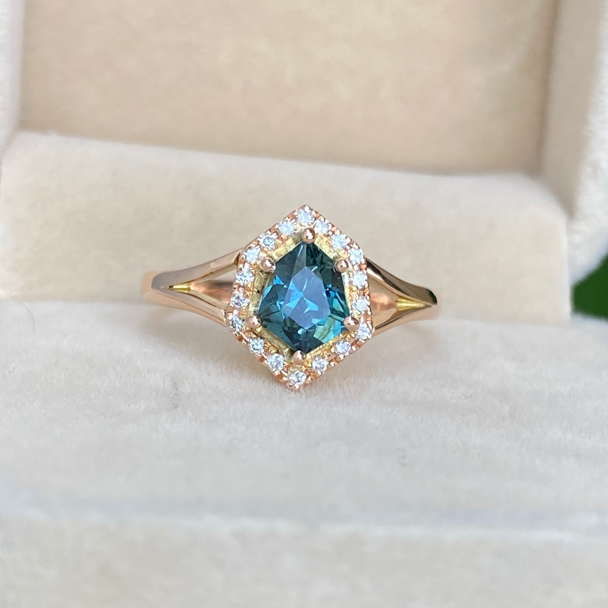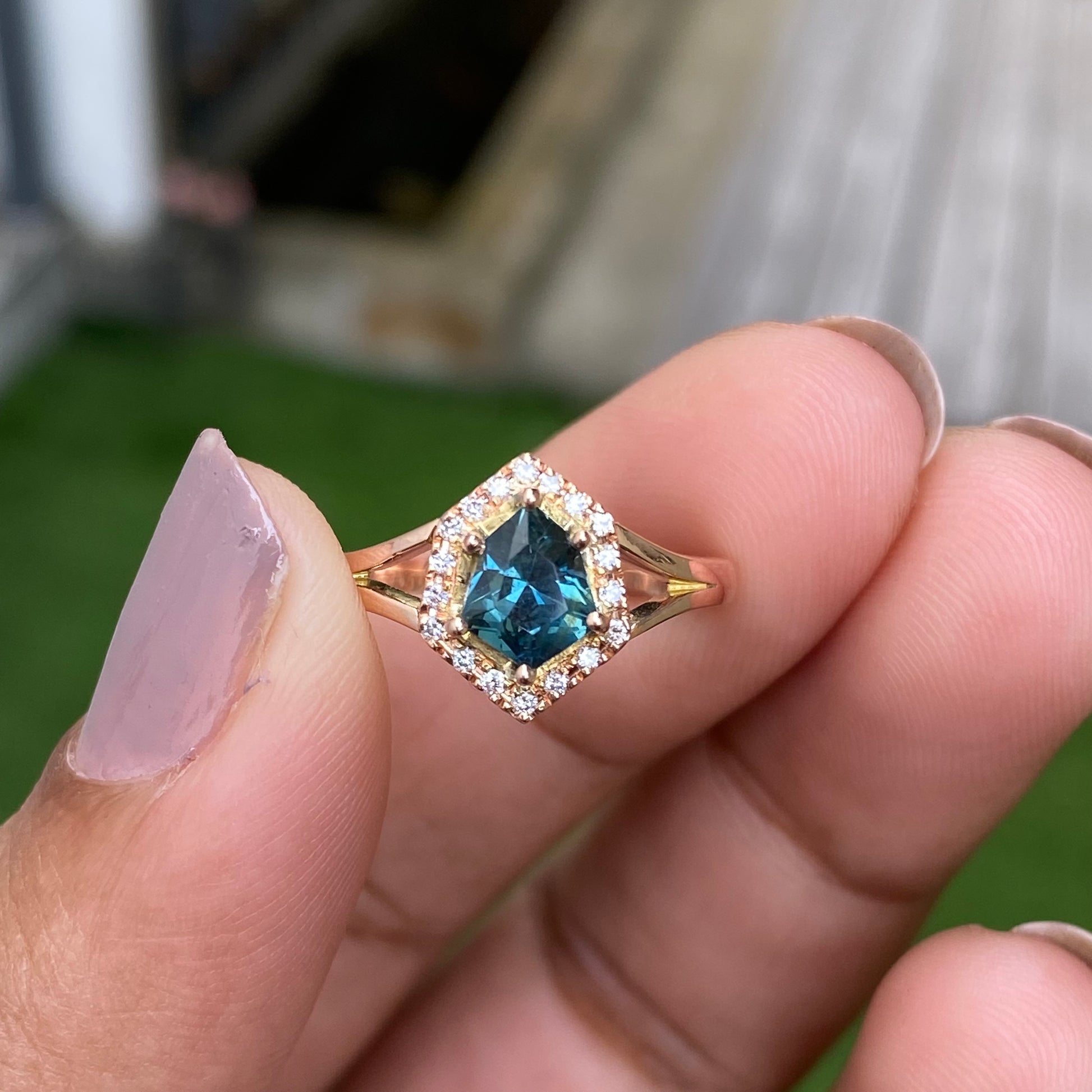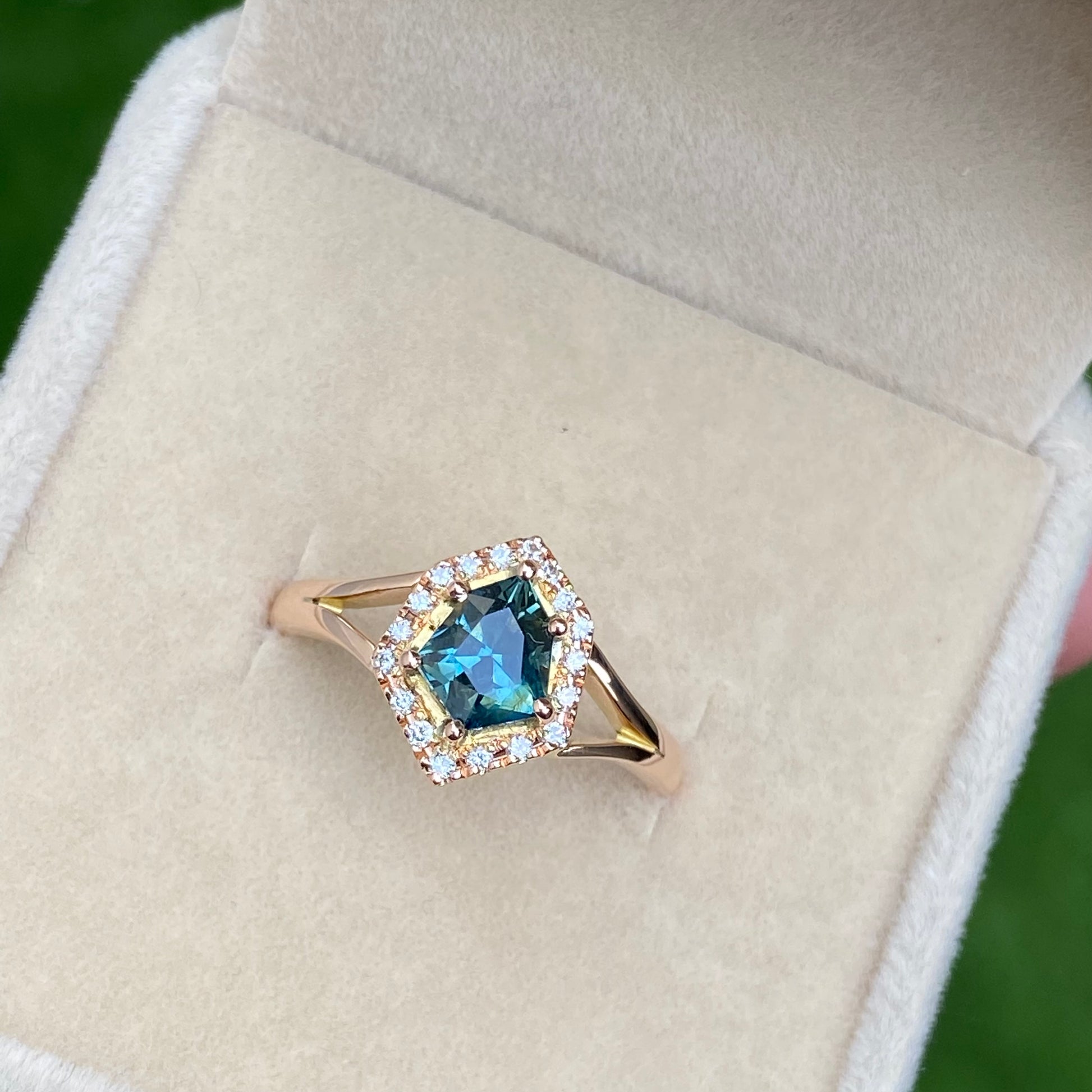 1.40 ct Teal Sapphire Engagement Ring, 14K Rose gold Diamond halo Ring