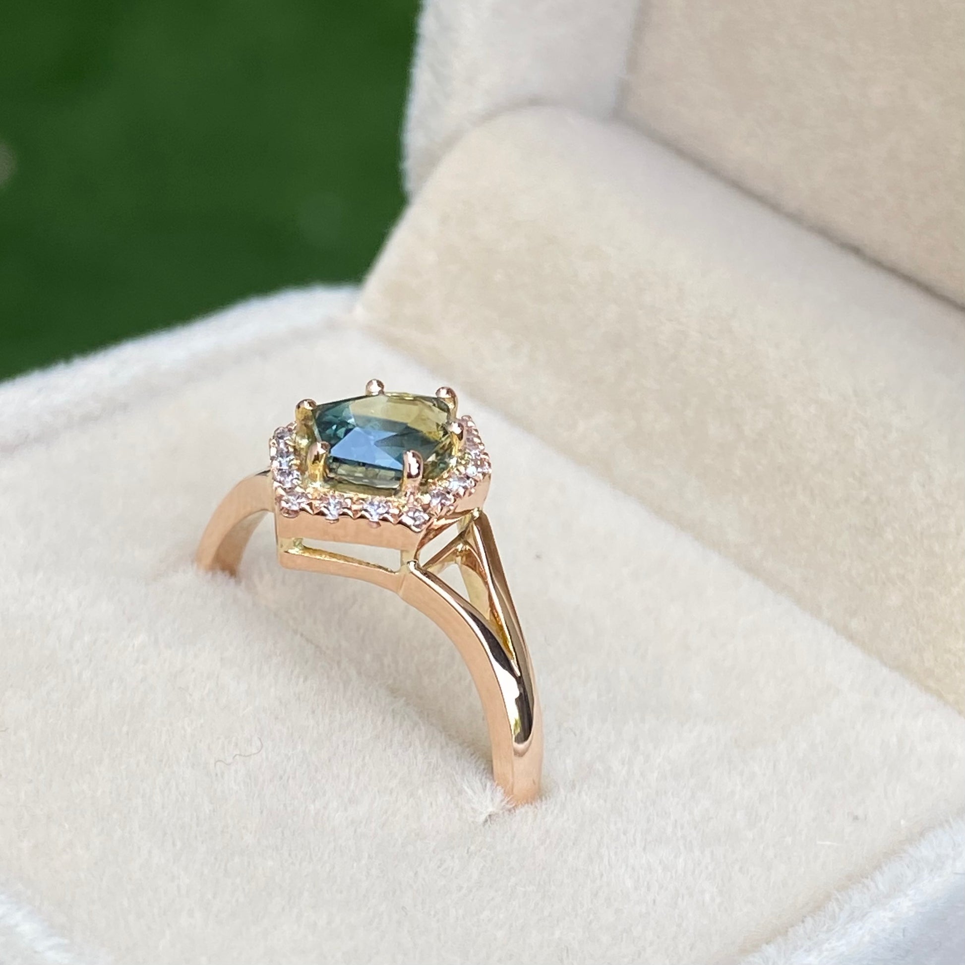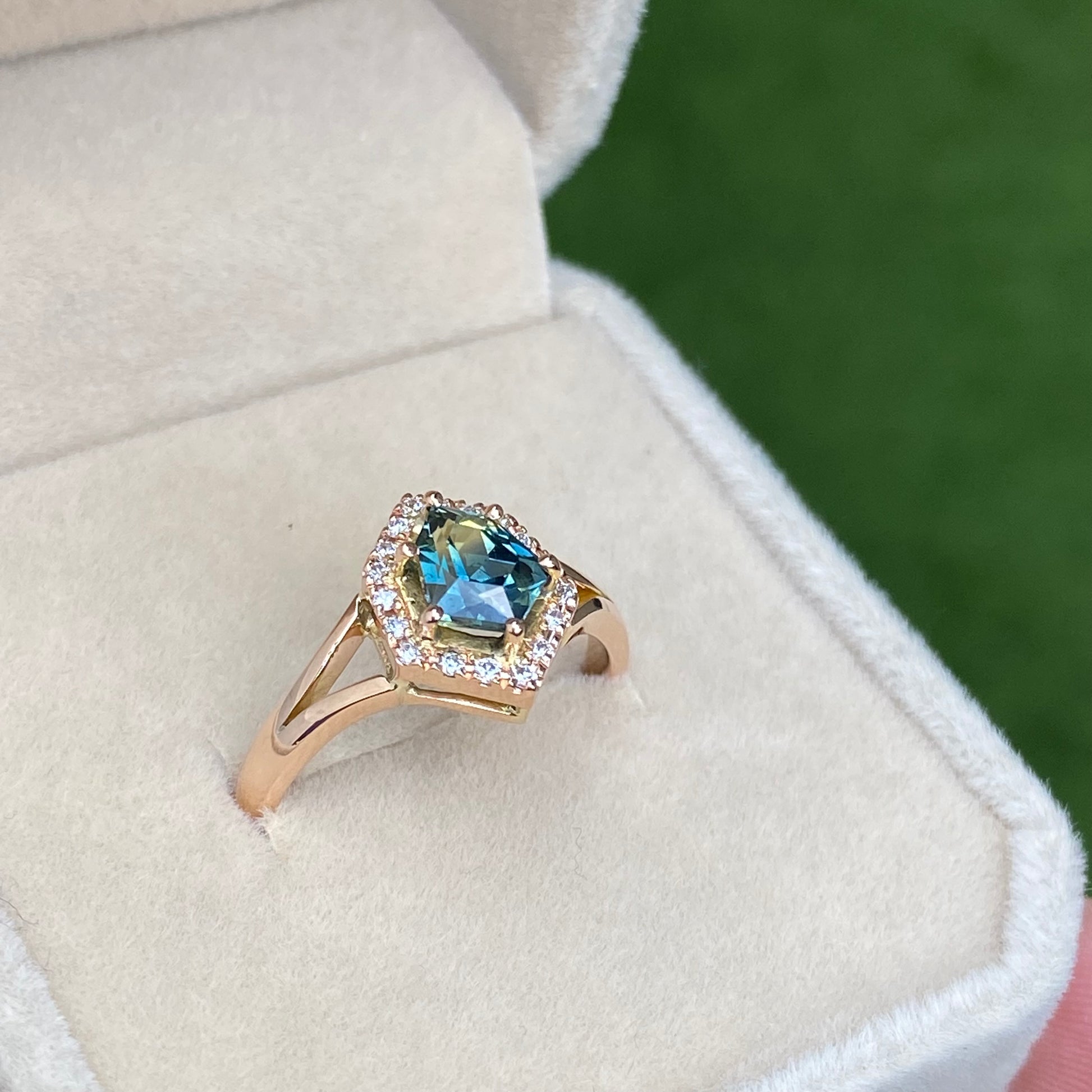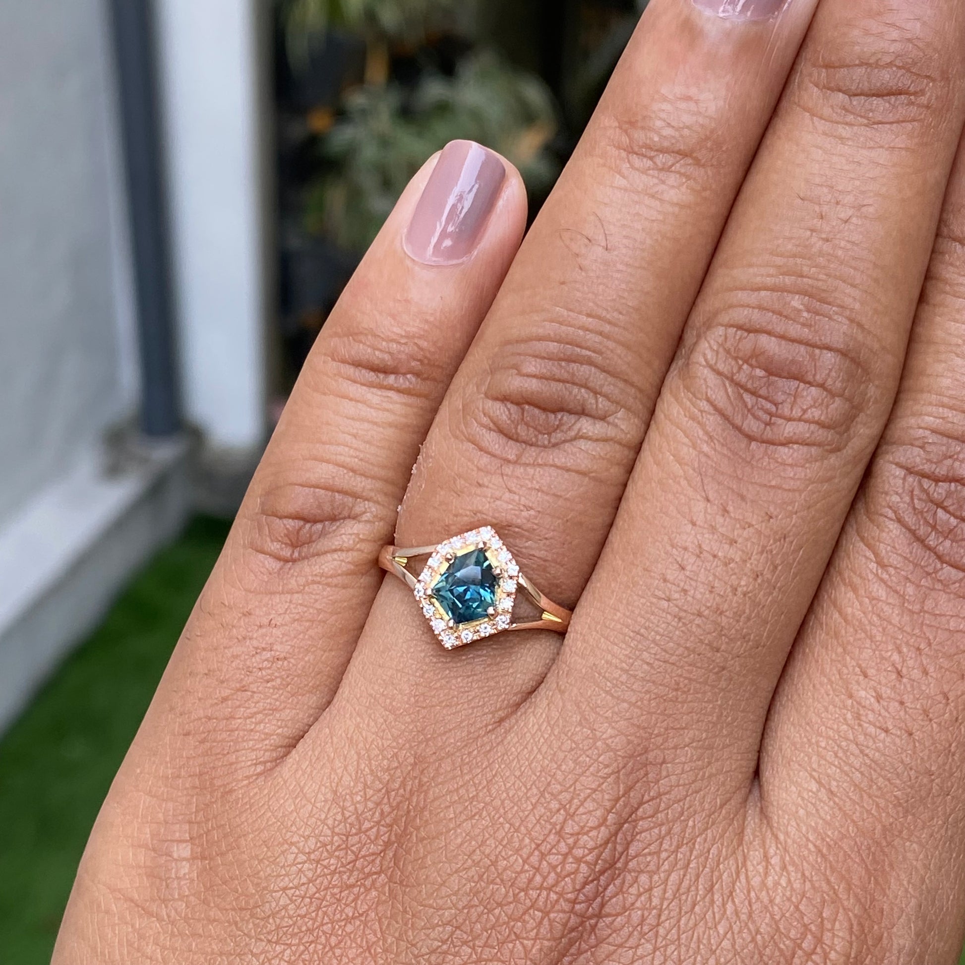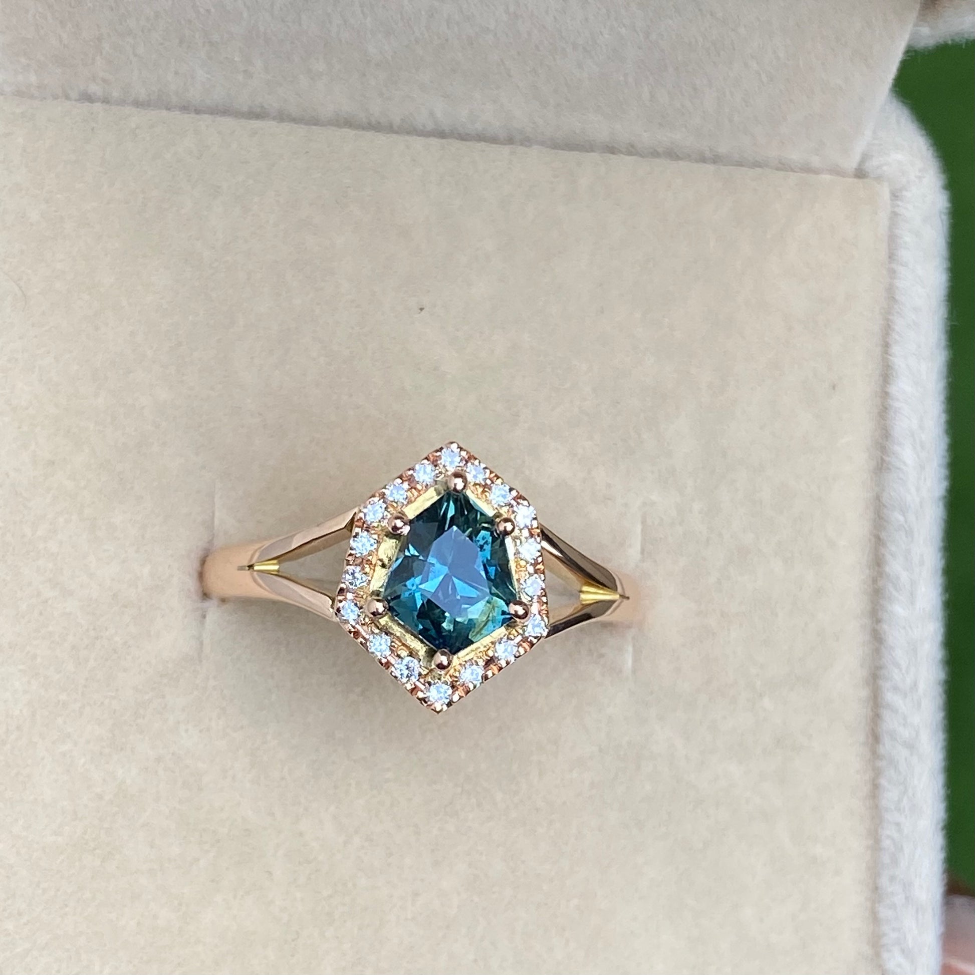 1.40 ct Teal Sapphire Engagement Ring, 14K Rose gold Diamond halo Ring